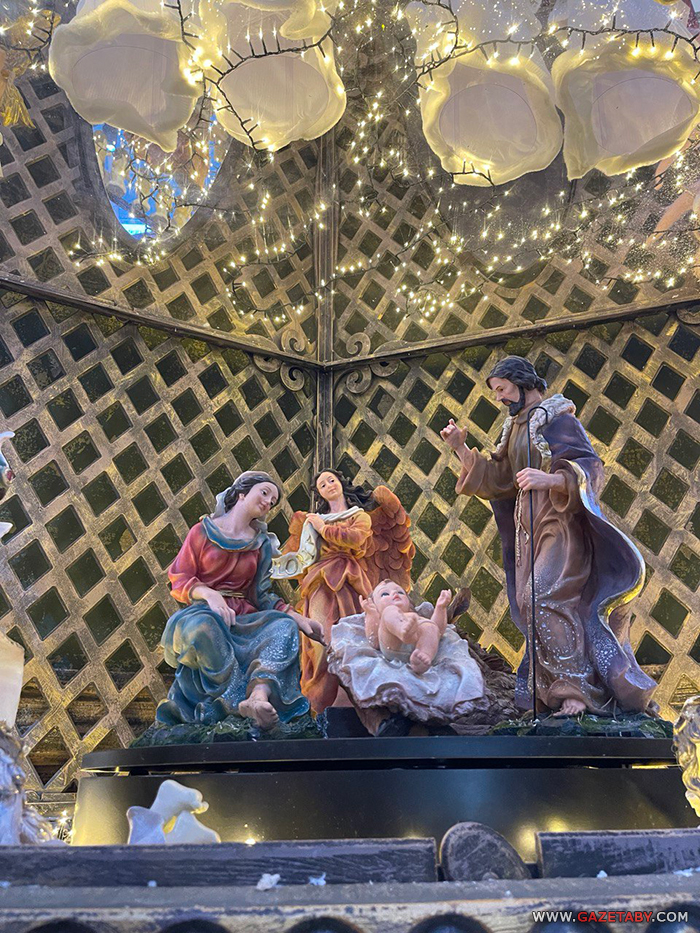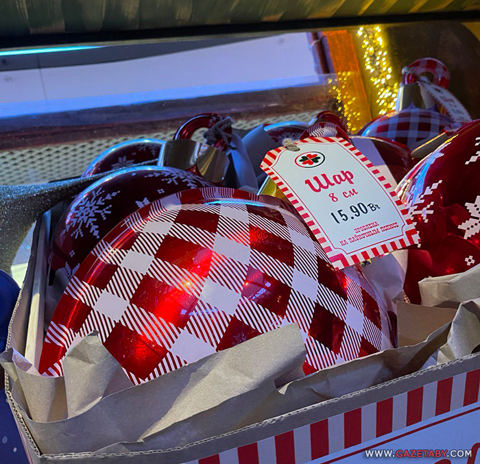На паліцах вялізныя святочныя дэсерты і ёлачныя цацкі, а таксама Дзяды Маразы, мядзведзі, каты, эльфы, анёлы і іншыя тавары.